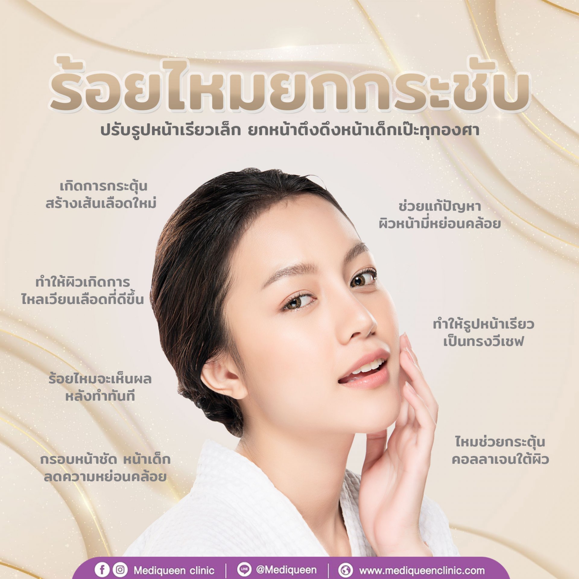 การร้อยไหม หนึ่งในเทคโนโลยีเสริมความงามที่ช่วยให้คุณดูอ่อนกว่าวัย ด้วยการยกกระชับผิวให้เต่งตึง เหมาะกับสาวๆที่ต้องการเพิ่มความมั่นใจให้กับตนเอง อยากมีใบหน้าเด็กอ่อนกว่าวัย ต้องยอมรับว่าการร้อยไหม เป็นที่นิยมอย่างมากในปัจจุบัน เพราะสามารถสวยได้ดั่งใจ แบบไม่ต้องพึ่งการผ่าตัด ที่สำคัญไม่ต้องพักฟื้นใดๆ สามารถใช้ชีวิตได้ปกติหลังจากการร้อยไหมได้ทันที ที่สำคัญทางเมดิควีนส์คลินิค มีแพทย์ผู้เชี่ยวชาญด้านการปรับรูปหน้า โดยเฉพาะการร้อยไหม และได้มีกระแสตอบรับจากไปในทางที่ดีอีกด้วย สำหรับใครที่สนใจอยากทราบข้อมูลเกี่ยวกับการร้อยไหม สามารถสอบถามทางคลินิคได้โดยตรง
