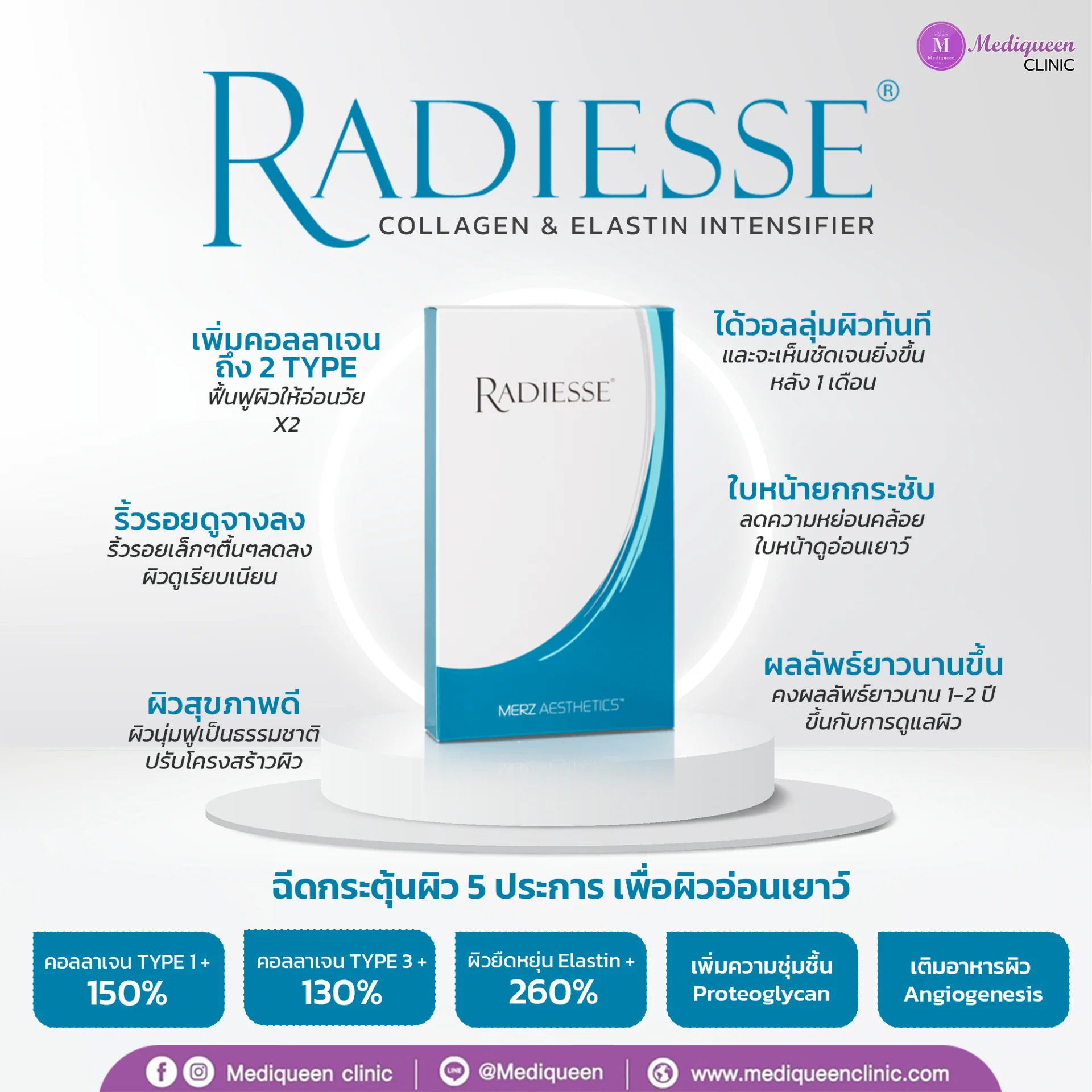 จุดเด่นของการใช้ RADIESSE เติมเต็มผิวมีส่วนช่วยในการเพิ่มปริมาตรผิวให้ดูอิ่มฟูในทันทีคล้าย Filler ทั่วไป อีกทั้งยังสามารถกระตุ้นการผลิตคอลลาเจนตามธรรมชาติในชั้นผิวหนังอย่างต่อเนื่อง และมีความโดดเด่นด้านฟื้นฟูร่องริ้วรอยและผิวที่เกิดการเสื่อมสภาพในระดับปานกลางถึงระดับสูงได้อย่างมีประสิทธิภาพ ยังสามารถสลายได้ตามธรรมชาติ จึงมีความปลอดภัยสูง ทำให้ผิวอิ่มฟู ดูอ่อนเยาว์อย่างยาวนาน โดยช่วยในการฟื้นฟูการทำงานของเซลล์สร้างเส้นใย (Fibroblast) ทำให้เกิดการกระตุ้นการสร้างส่วนสำคัญทั้ง 5 อย่างที่มีส่วนช่วยให้ผิวสุขภาพดี ได้แก่